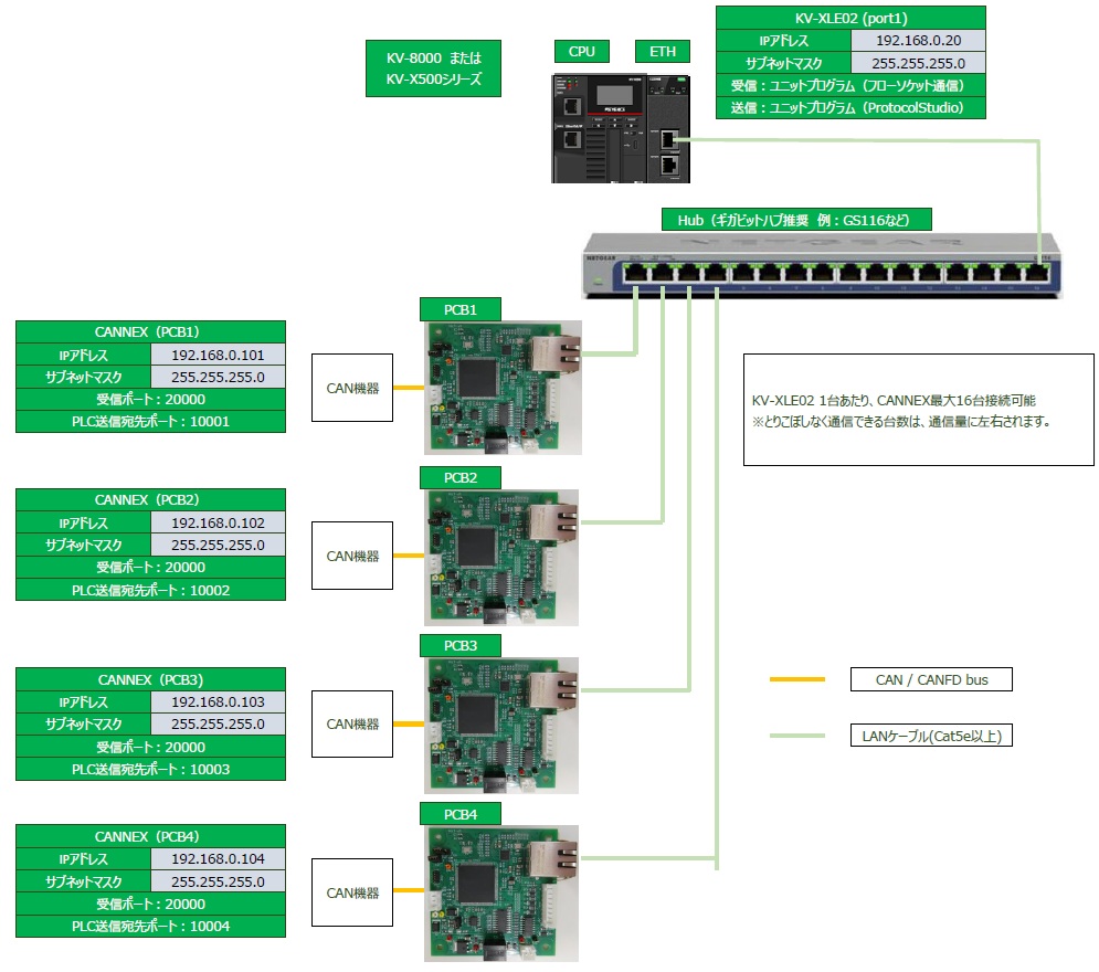 UDP通信のできる機器であればCANNEXを使用してCAN通信を行うことができますが、弊社はKV-XLE02(KEYENCE)を推奨しています。サンプルプログラムやマニュアルの説明はKV-XLE02を使用して記述しています。